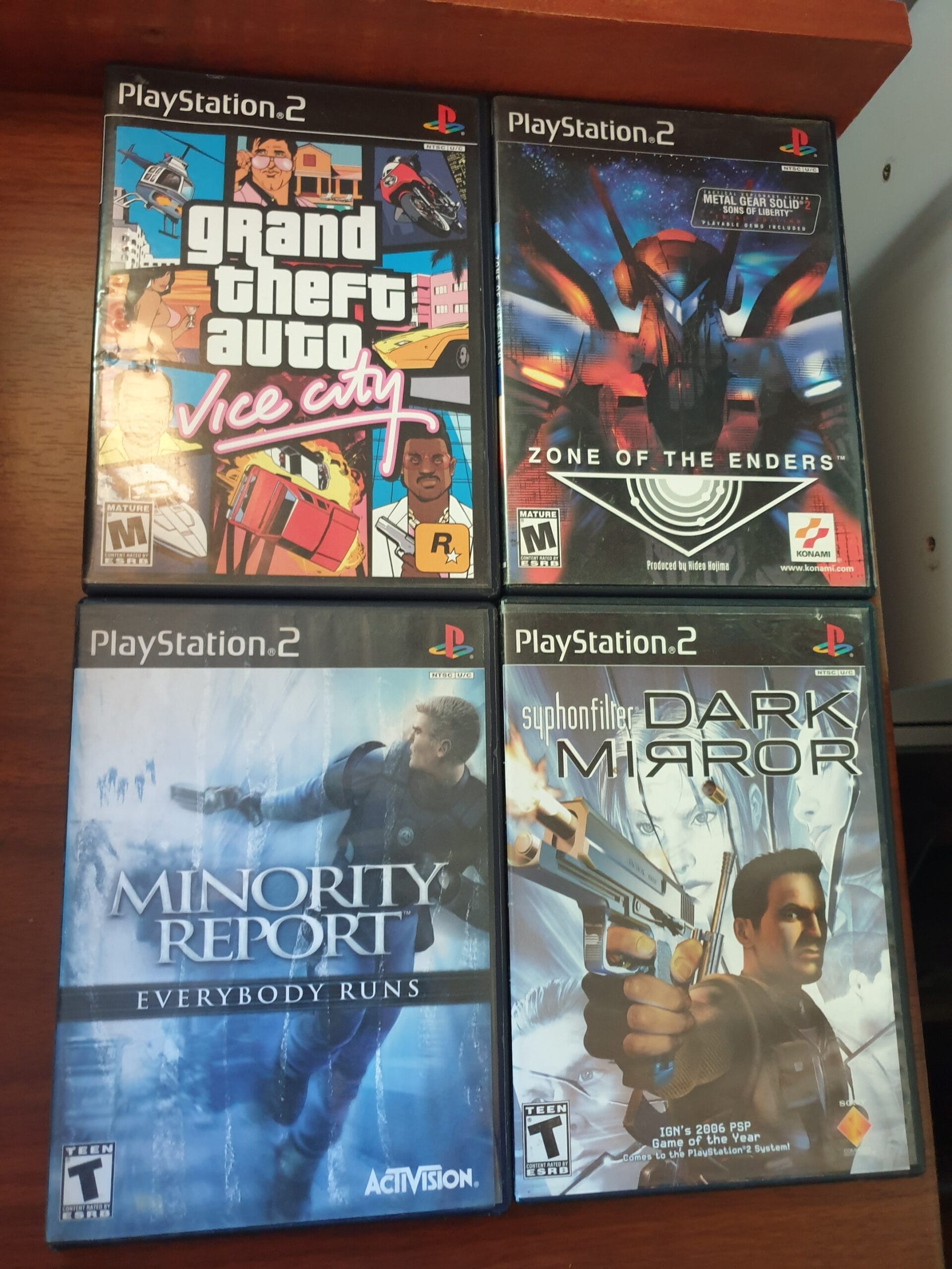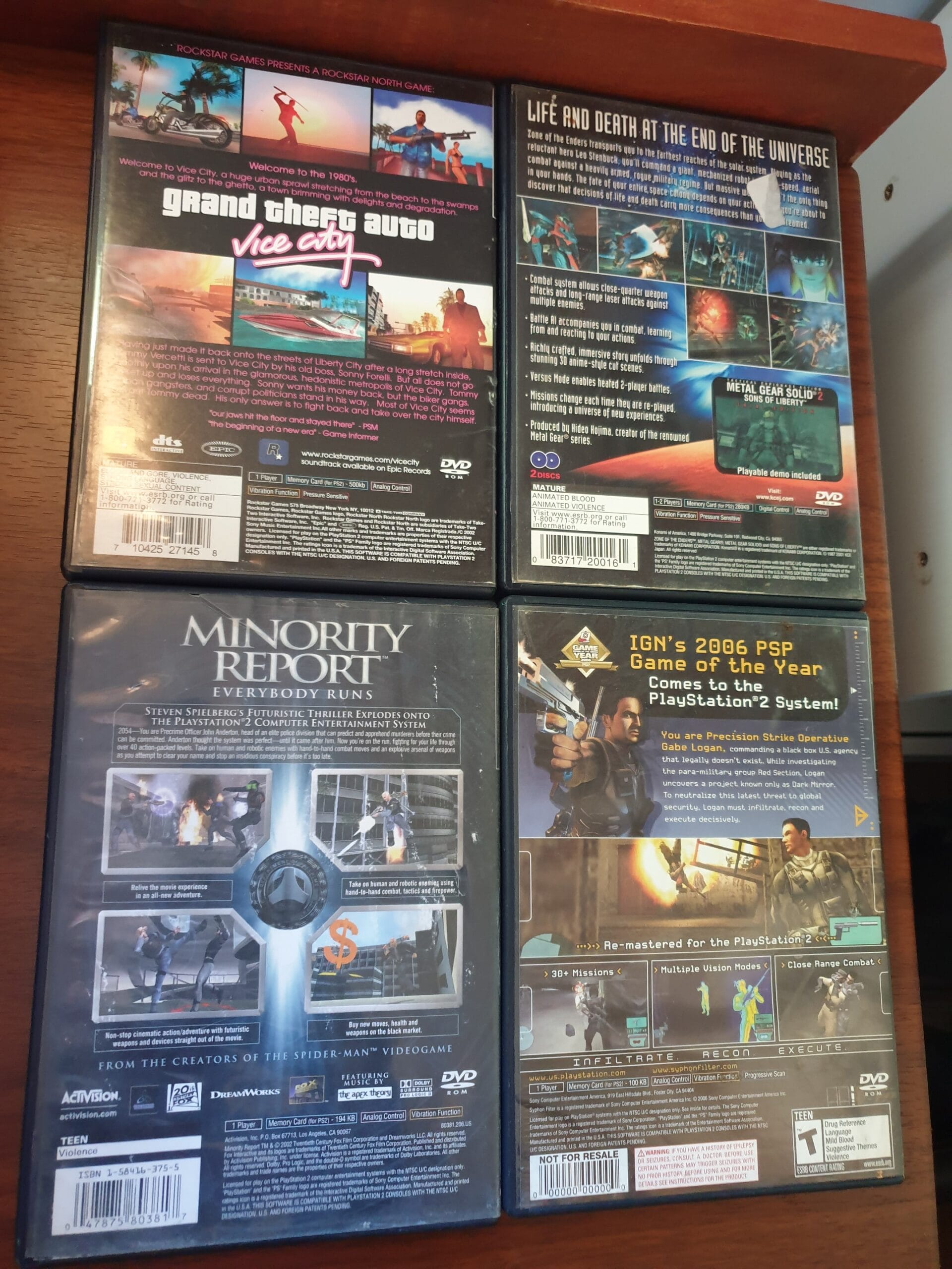 Lote que contiene detalles, el minority presenta humedad en manual y carátula, zone of enders no tiene manual y el gta no tiene el disco